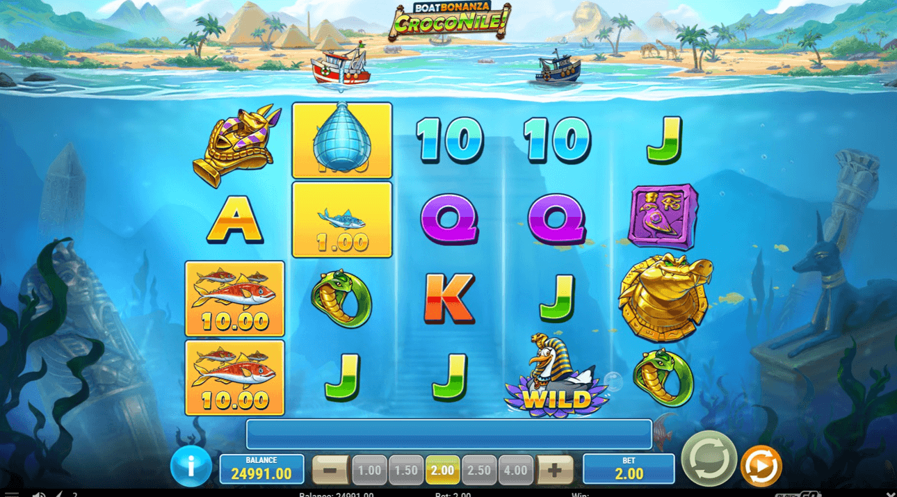 La acción de Boat Bonanza CrocoNile transcurre en un mundo submarino y, como sugiere el nombre, está ambientado en el Nilo. Así que habrá muchos sarcófagos y otras reliquias del Antiguo Egipto y, en la superficie, verás la Gran Esfinge y las pirámides.